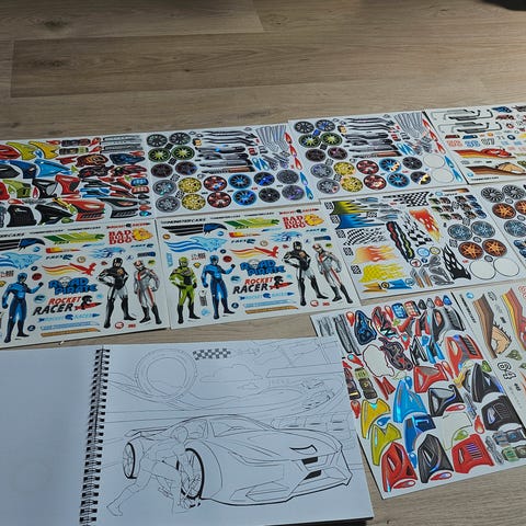Tre plastark med sjablonger, et ark med hjul-klistremerker og resten av heftet er hvite sider med ulike biler stripet opp i grått så man kan fargelegge/designe selv.