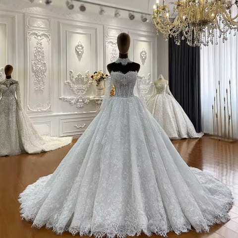 Veldig fin brudekjole med slep og sløyfe på baksiden. Vakker mønster og design.
