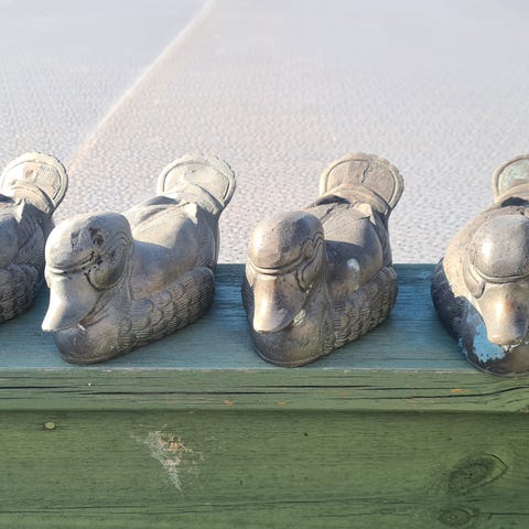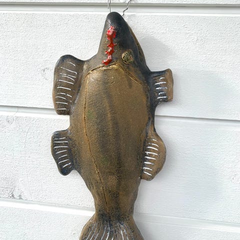 Fuglen er støpt i betong i en latexform. Den er malt med maling som tåler utevær. Fuglen veier 2,5 kg og har et vingespenn på 42 cm. Prisen er 100 kr pr stk. Fuglene er malt i mørk grønn farge. Må hentes, kan ikke sendes.