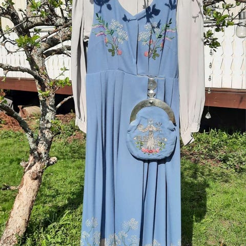 Bunaden følger med lyseblå skjorte, lue, veske og belte.
