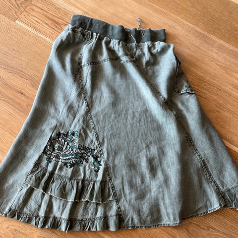 Knelangt skjørt med mønster i sjøgrønn farge. Lite brukt.