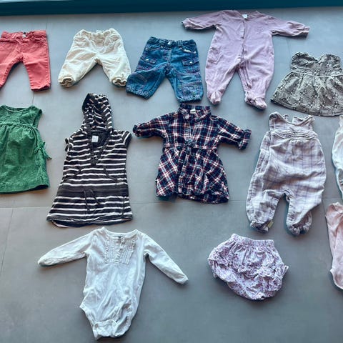 4 par bukser/tightser, 4 bodyer, 1 pysj, 2 cardigan og ett par skinntøfler.