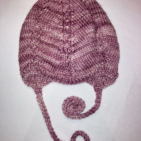 2 stk helt nye hjemmestrikkede babyluer i ull. Den lilla er 14 cm fra bakhodet og til front samt 40 cm i omkrets. Den er strikket i babyull. Kr 125,-