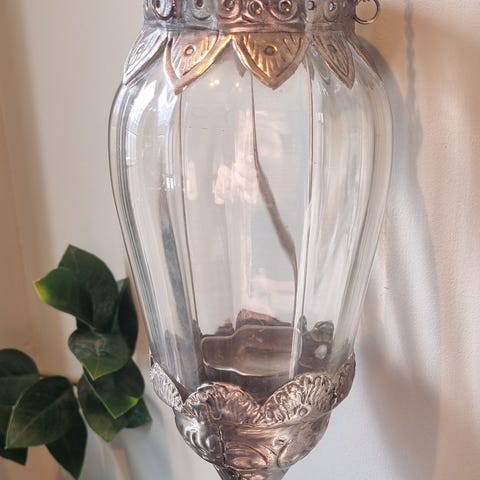 Den har orientalsk preg, og er laget av glass og hamret, mønstret metall, perfekt til telys.