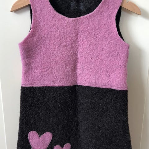 Mørk lilla strikket ullkjole m hjertedekor, håndlaget fra Galleri Unika (i Asker). Tykk varm og god. Ca str. 8 år og romslig. Svært lite og pent brukt av enebarn og kun vasket noen få ganger m Milo ullvask.