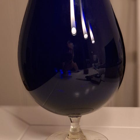 Fin bolle på stett i kobolt blå farge .19 cm høy.Er nok rundt 1960-70 tallet .Kan sendesmed post nord til 69 kr for frakt som kjøper betaler.Utenom fiks ferdigt.