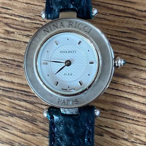 Lekker klokke i sort med stener, reimen er noe slitt.