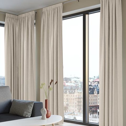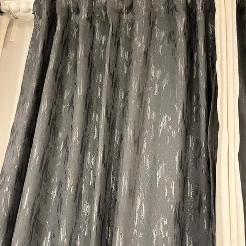 Gardinene fremstår som mørke med innslag av krem, grå og grønn. Veldig fine.
