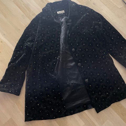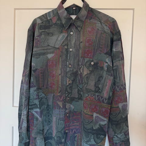 Selger en sjelden og eksklusiv vintage-skjorte i myk, lett kvalitet med elegante volanger langs knapperekken. Skjorten har en romantisk og edgy look som gir antrekket et særpreg. Perfekt for deg som elsker unike plagg med karakter!