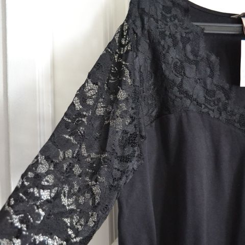 Pent brukt sort kjole uten ermer, med pynt på skulder og detaljer bak på den ene siden. Str. 42. Kr.75.. Heradsbygda.