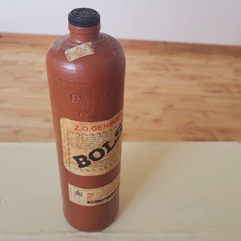 Eldre Genever flaske fra Rotterdam, høyde 30 cm, diameter 9 cm.