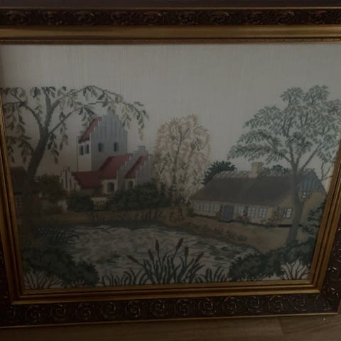 Gammelt og flott brodert bildet med høst-motiv.