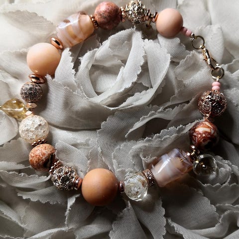 Nydelig armbånd med AA-grade 10mm, irregulære skiver av citrine, aquamarine og morganite. Laget med sølv "spacers", lås og Lotus anheng. Total lengden er 20cm. Passer best til håndledd på 16-19cm. Veldig feminint. Som alle mine smykker, er dette også "One of a kind". Jeg sender gjerne mot frakt. Ønsker ikke pruting.