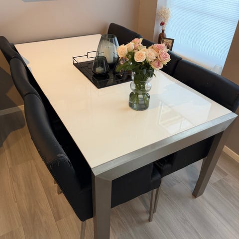 Hvit spisebord selges.Mål:B:90×L:180 cm .Det er noen riper og flekker på bordet.Bordet er ganske tungt.Trenger 2 personer for å bære det.Kan demonteres.