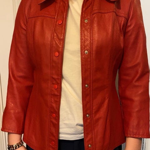 Jakke med front i skinn og rygg/ ermer i strikk.