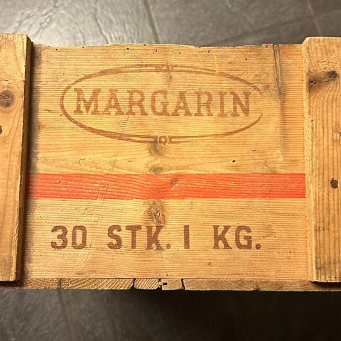 Porsgrund Margarinfabrikk trekasse ,mål: l. 58cm,br37, h.26cm,uten skader. men patina av alder. Kan være fra 40-50 tallet.