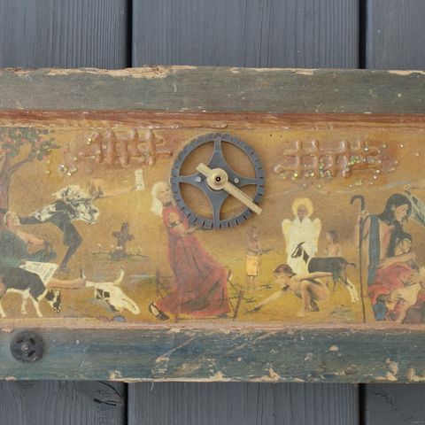 Flott rosemalt veggklokke som mangler urverk. Høyde: 49cm og bredde: 35cm. (Se gjerne mine andre annonser også)