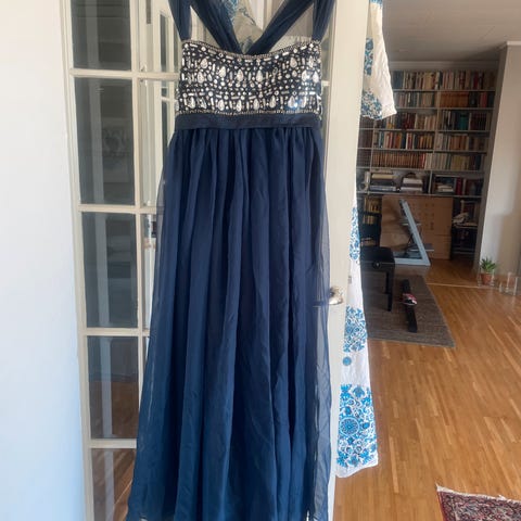 Helt ny og ubrukt ballkjole. Skjørtet er i tyll, og overdelen har kledelig pynt i strass. Kjolen passer en størrelse 36, og er sydd slik at overdelen enkelt kan legges ut rundt brystet (se siste bildet).