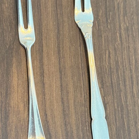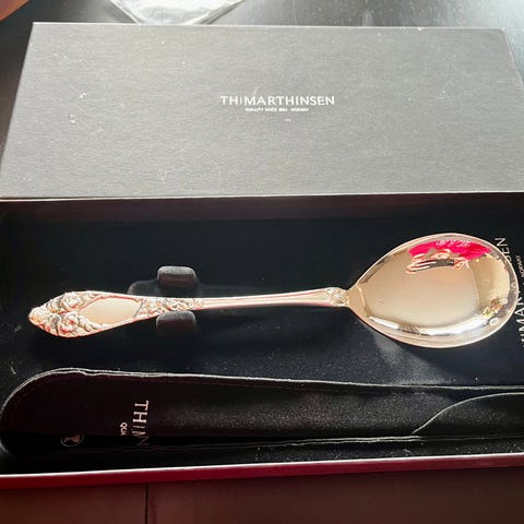 Emaljert sølvskje, kjøpt i 1988 og blitt liggende i esken ubrukt. På kvitteringen er den benevnt « syltetøyskje». Ca 15 cm lang.