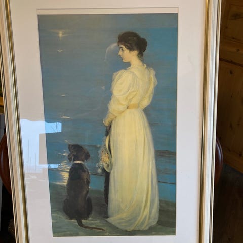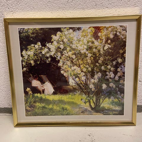 Selger koselig bilde "Roser". Kunstneren Peder Severin Krøyer malte sin kone Marie Krøyer (sin yndlingsmodell) i deres hage i 1893, innrammet og i god stand.