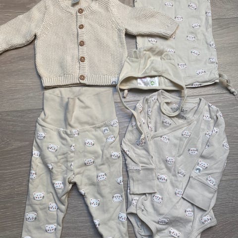 Selger nesten ubrukt sett til baby i str. 56 til 62 i veldig myk og behagelig stoff. Pris er kr 200.