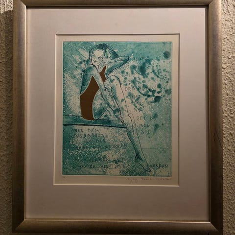 Det er signert, men ikke nummerert. Det står det PA til venstre, som gir den en liten + i verdi. Det er trykk som er holdt utenom det regulære salgs opplaget. Vanligvis kunstner beholder 10% av trykk til eget bruk og salg. Kan nummereres med romertall eller ikke nummerert i det hele tatt.