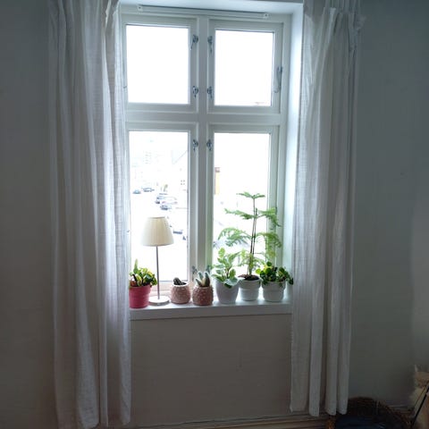 Flotte gardiner i krafig bomullsstoff. 2 lengder på 2,10m og 2 lengder som passer til skråvindu. Brukt i 1 år. Pris nye kr 10.000,-