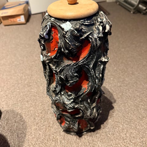 Hel og fin kunst vase i rødt og sort glitrer i grønn hvit på innsiden se bilde