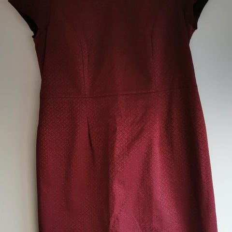 Marineblå med strukturmønster. Aldri brukt, ble litt for kort for meg. Brystvidde 108cm, sidde ca 103cm. Nydelig kjole.