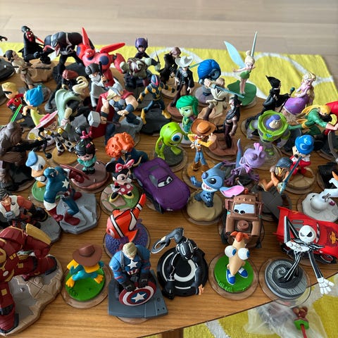 Selger 11 stykk pent brukt Disney Infinity Marvel inklusiv disk, 1 spill plate og 2 krystaller.