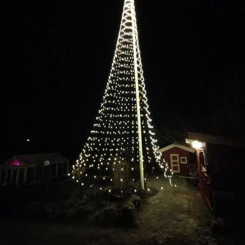 Tre med LED på hele overflaten: Dette juletreet med lysdioder på hele overflaten har en høyde på 500 cm og en diameter på 160 cm. Det er spesialdesignet med 732 varmhvite energieffektive lysdioder i en rett formet formasjon.