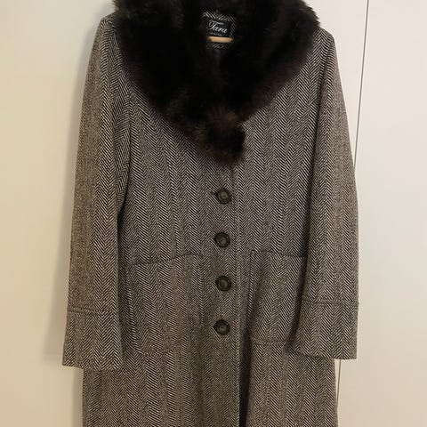 Brun, foret jakke fra Tara i 100% ull, størrelse 44. Stikklommer i sidene. Dobbeltkneppet med 4 knapper. Liten splitt bak