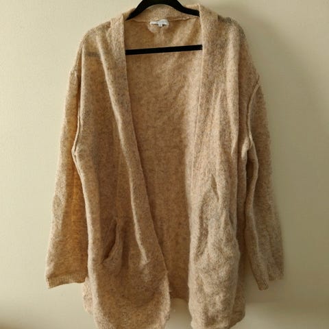 Utrolig fin Cardigan i mørk blått og sølvskimmer, med skinndetaljer.