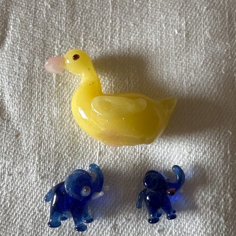 Selger 7st små lys blå elefanter i glass. Passer i sette hylla.