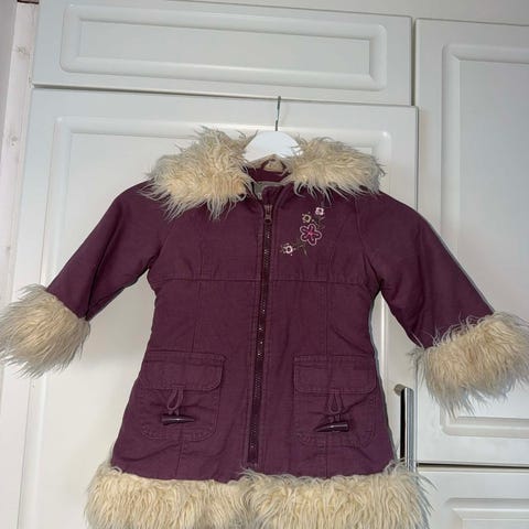 Størrelse 110, med deilig fuskepels på armer og rundt hals og fine broderier fremme og bak.