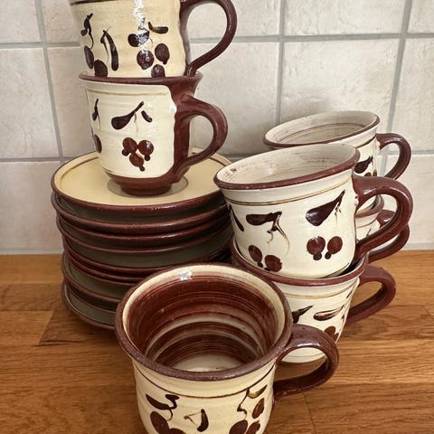 Norsk produsert håndlaget keramikkservise til 12 personer. Kaffe-mokka og ekspresso kopper. Kaffekanne med tilhørende melk/fløtemugge og sukker/godteskål. Lite brukt, uten skader. Alle deler er preget med kunstners initialer på undersiden. Gi bud. Serviset kan hentes/leveres i Drøbak og Holmestrand..