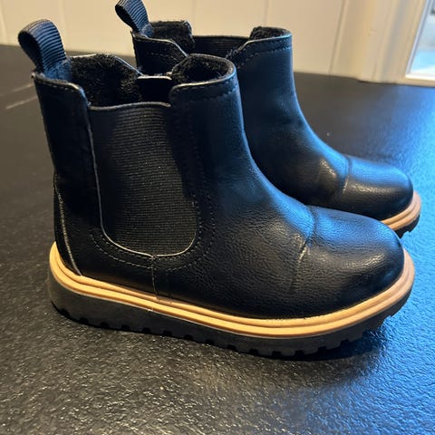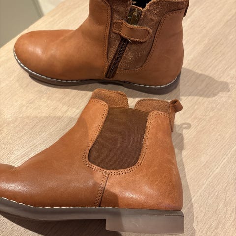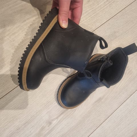 Nesten ubrukte chelsea boots i str 28. Varmt fôr inni. Godt mønster under slik at de ikke er glatte. Elegante pensko som er gode og varme for barnet å gå med.