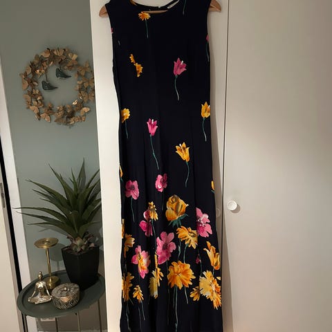 Penkjole med grunnfarge i blått, blomster i aprikos/oransje og blader i grønn og offhvite. Kjolen er brukt en gang. Kjolen er 1,40 lang, for flere mål se egen tegning.Mål er foran på kjolen. Stoffet er av viskose og polyester. Det er litt stretch i stoffet. Kan sendes, men tillegg for porto.