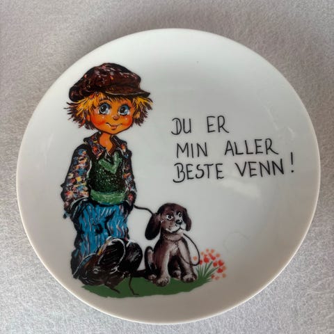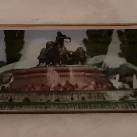 Nydelig fat med bilde av springvandet gefion i København. Fatet er i glass med guldkanter og måler 21,5 ×8,5 cm