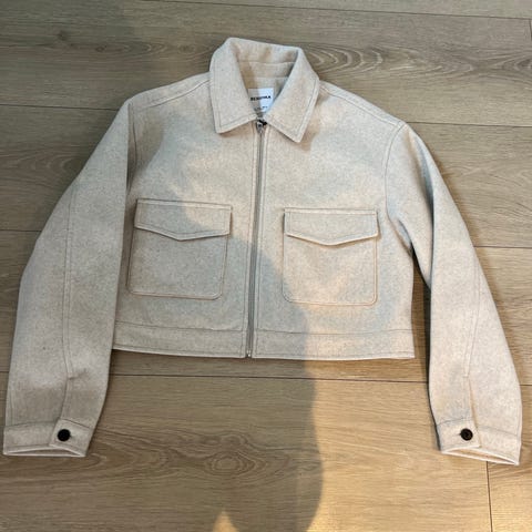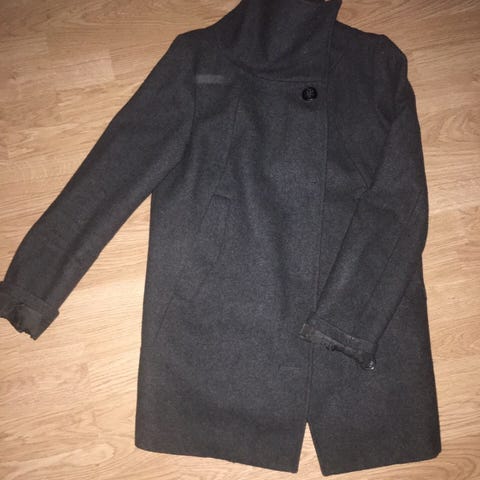 Dobbeltspent kåpe med knyting i livet, to lommer foran. Lite brukt.