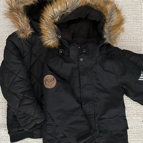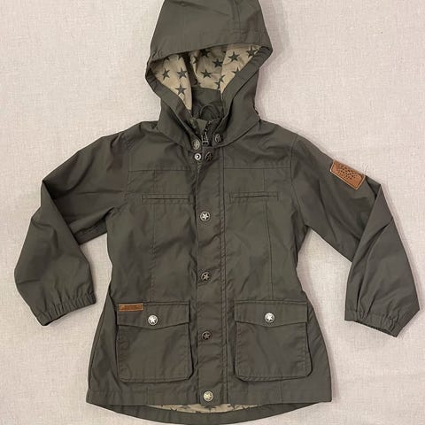 Supertøff jakke fra KappAhl, str 122. Jakken er foret, og har mykt, rutete bomullsstoff inni.Avtagbar hette og stramming i livet. God lengde. Jakken er pent brukt.