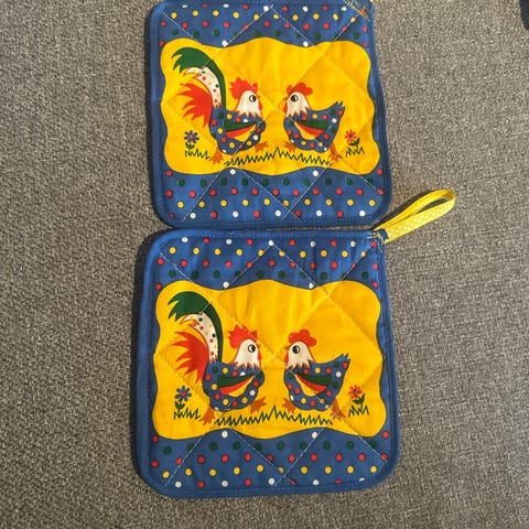 to grytelapper 19 x 19 cm. Settet kommer fra det gamle firmaet Mobila Norge as, og er fra 80- tallet.