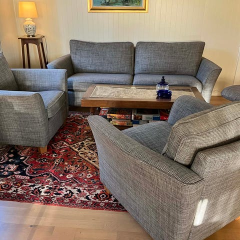 Vi har brukt sofaene på hytten, så de er lite brukt, selv om de nå er 8 år gamle. Det er 15års garanti på disse fra Møbelringen.