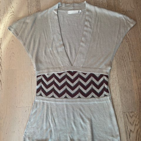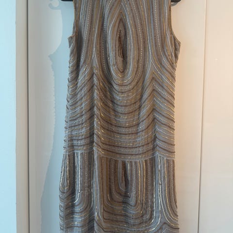 Dagmar kjole med gullskimmer og flotte detaljer. Kjolen har en V-hals, er ermeløs, og har detaljer i strikkemønster både foran og bak.