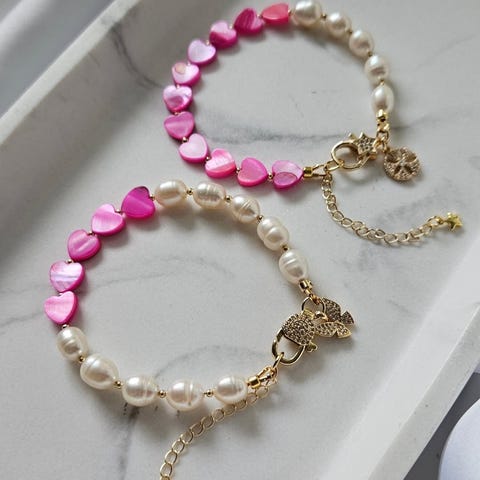 Nydelig håndlaget armbånd med matchende ørepynt. En fantastisk gave, både til deg selv og til din kjære, vennina, datter, kjæreste, kone, mor eller søster. Armbåndet er laget av narurlige ferskvannsperler, som er enkelt å sette på og av armen, og låsen og ørepynt pyntet med zirkonstein, 14k gullbelagt metalldeler. Nydelig og utrolig vakkert sett som passer fint til de fleste anledninger.