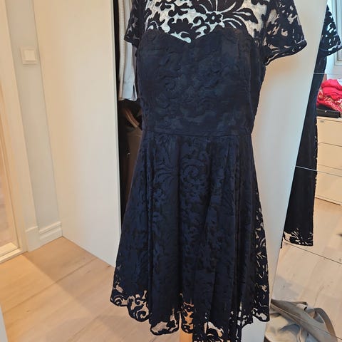 Pen, elegant mørkeblå Riccovero kjole i str. 40, modell Symra dress. En nydelig kjole med blonder og transparente korte ermer. Kjolen har aldri vært brukt, har kun hengt i garderobeskap.