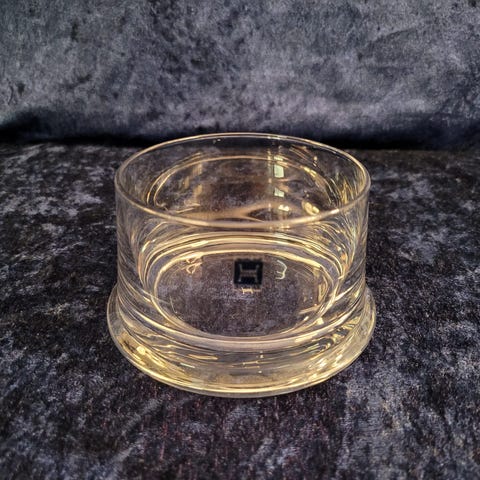 Liten skål som er ca 8,5 cm i diameter. Passer fint til bordsalt, oliven eller lignende. I grått tungt glass. Må hentes i Kristiansand eller sendes om kjøper betaler frakt.