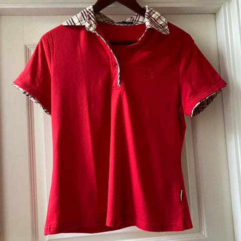 Som ny. Topp fra New House i 95 prosent bomull. Cerise piquestoff. Liten volang med knapper i front.
