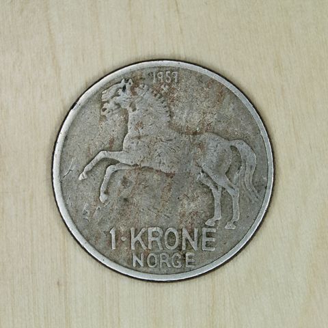 Norsk Mynt 1 Krone 1917 Sølv. Denne mynten er fra 1957 og er laget av sølv. Den har et portrett av en norsk konge på den ene siden og Norges riksvåpen på den andre. Mynten er beskyttet i et plastetui for å bevare dens tilstand.