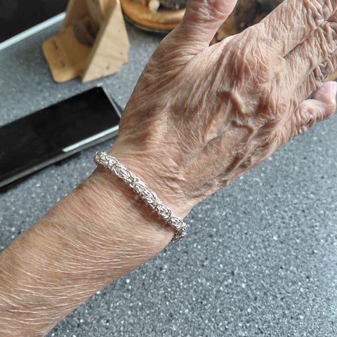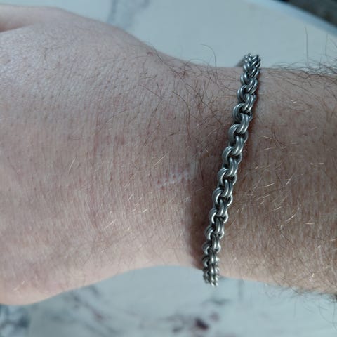 Armbandet er på 20 cm, laget med 2, 5 mm sølvtråd. Veier 120 gram. Sølvprisene endrer seg så melding etter en pris